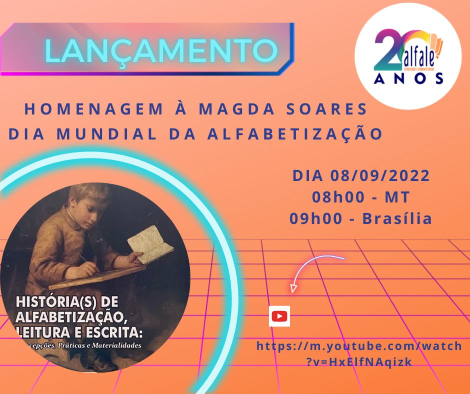 O Grupo de Pesquisa Alfabetização e Letramento Escolar - ALFALE, da Universidade Federal do Mato Grosso (UFMT), realiza no próximo dia 08, quarta-feira, live de lançamento do livro "História(s) de alfabetização, leitura e escrita: concepções, práticas e materialidades". Dentro da programação, que acontece no Dia Mundial da Alfabetização, também haverá uma homenagem à professora Magda Soares, que completa 90 anos no dia 07 de setembro.
