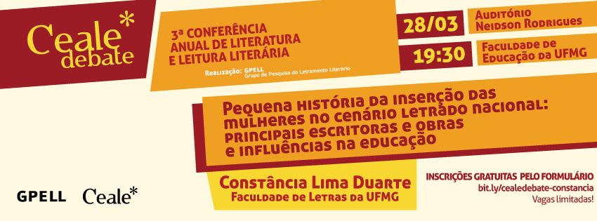 No mês em que é lembrada a luta das mulheres de todo o mundo por seus direitos, o Ceale Debate traz a presença na literatura como tema, em seu primeiro evento do ano. A professora Constância Lima Duarte, da Faculdade de Letras da UFMG, é a convidada para falar sobre a "Pequena história da inserção das mulheres no cenário letrado nacional: principais escritoras e obras e influências na educação". Na ocasião, o Ceale Debate recebe a 3ª Conferência Anual de Literatura e Leitura Literária do GPELL, grupo do Ceale dedicado aos estudos do letramento literário. O evento será realizado no dia 28 de março (terça-feira), das 19h30 às 21h30, no Auditório Neidson Rodrigues da Faculdade de Educação da UFMG, campus Pampulha (Avenida Antonio Carlos, 6.627).