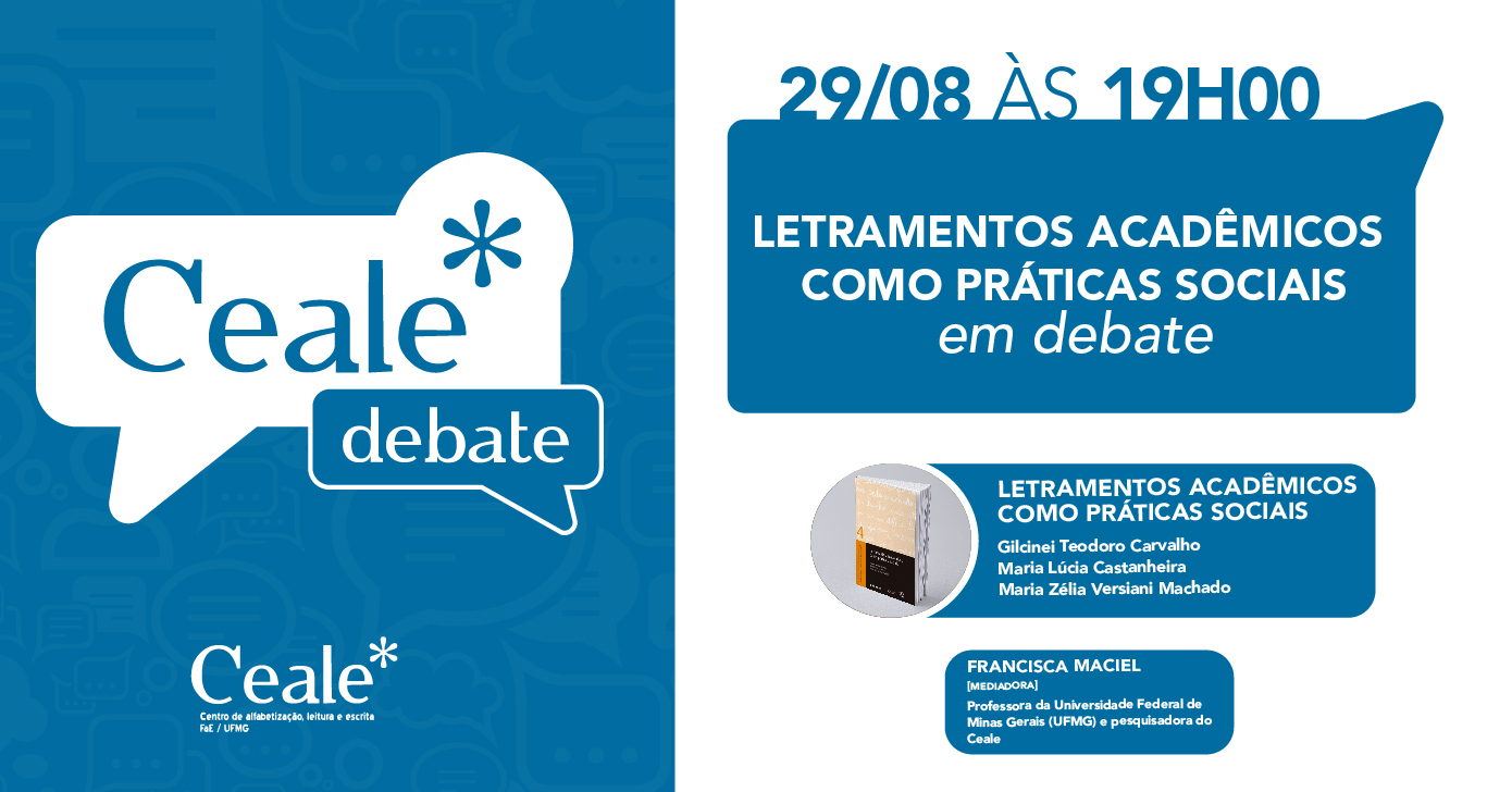 O Ceale Debate retorna neste segundo semestre com diálogo sobre o recém-lançado “Letramentos acadêmicos como práticas sociais”, livro de autoria do professor Gilcinei Teodoro Carvalho e das professoras Maria Lucia Castanheira e Maria Zélia Versiani. Para o debate, receberemos o professor Gilcinei e a professora Maria Lucia que apresentarão a obra, o percurso de produção e abordarão questões relacionadas a concepções de letramento, práticas de letramento escolar/acadêmico e reflexões sobre o desafio de abordar o letramento como prática social.