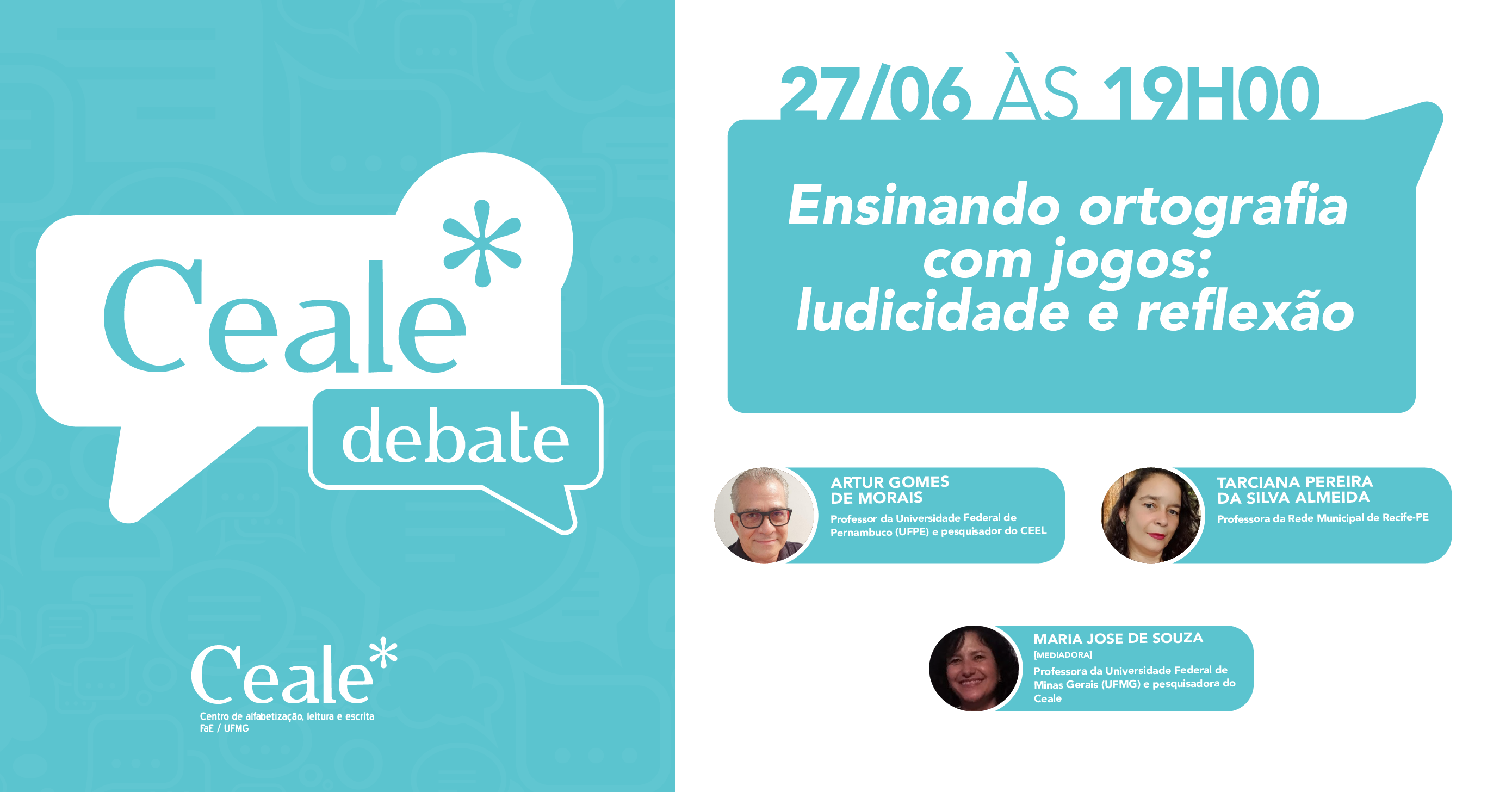 No dia 27 de junho, às 19h, o Ceale Debate recebe o professor da Universidade Federal de Pernambuco, Artur Gomes de Morais, e a professora da Rede Municipal de Recife-PE, Tarciana Almeida, para falar sobre o ensino da ortografia através de jogos e ludicidade.