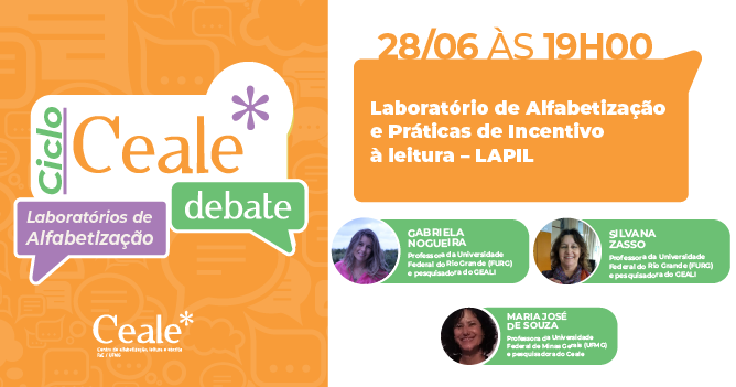 No próximo dia 28 de junho, terça-feira, às 19h, o Ceale Debate encerra o Ciclo sobre Laboratórios de Alfabetização com o LAPIL - Laboratório de Alfabetização e Práticas de incentivo à leitura, da Universidade Federal do Rio Grande (FURG).