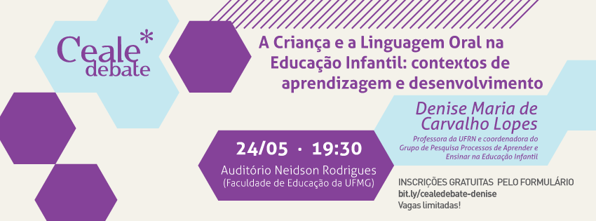 O papel da linguagem nos primeiros anos de vida revela a importância de se pensar nos processos de aprendizagem a ela relacionados na Educação Infantil. Para desenvolver essa temática, o Ceale Debate de maio recebe a professora da UFRN Denise Maria de Carvalho Lopes, que falará sobre  "A Criança e a Linguagem Oral na Educação Infantil: contextos de aprendizagem e desenvolvimento". O evento será realizado no dia 24 de maio (terça-feira), das 19h30 às 21h30, no Auditório Neidson Rodrigues da Faculdade de Educação da UFMG, campus Pampulha (Avenida Antonio Carlos, 6.627)