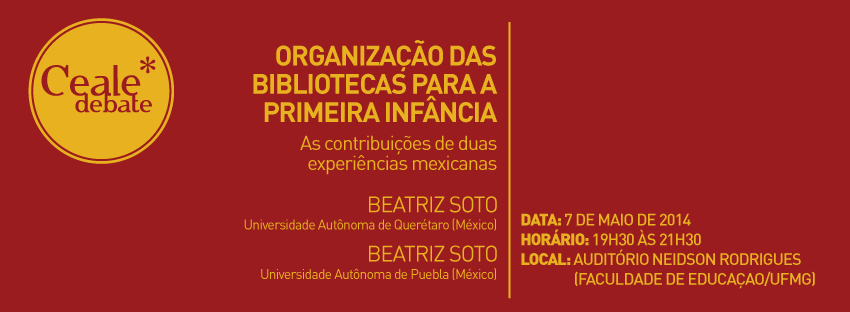 Com o tema “Organização de bibliotecas para a primeira infância: as contribuições de duas experiências mexicanas”, a próxima edição do Ceale Debate abordará as questões referentes às bibliotecas especializadas para crianças de até seis anos de idade. O evento é na próxima quarta (7 de maio), das 19h30 às 21h30, no Auditório Neidson Rodrigues da Faculdade de Educação da UFMG (Av. Antônio Carlos, 6.627 - Campus Pampulha – Belo Horizonte)