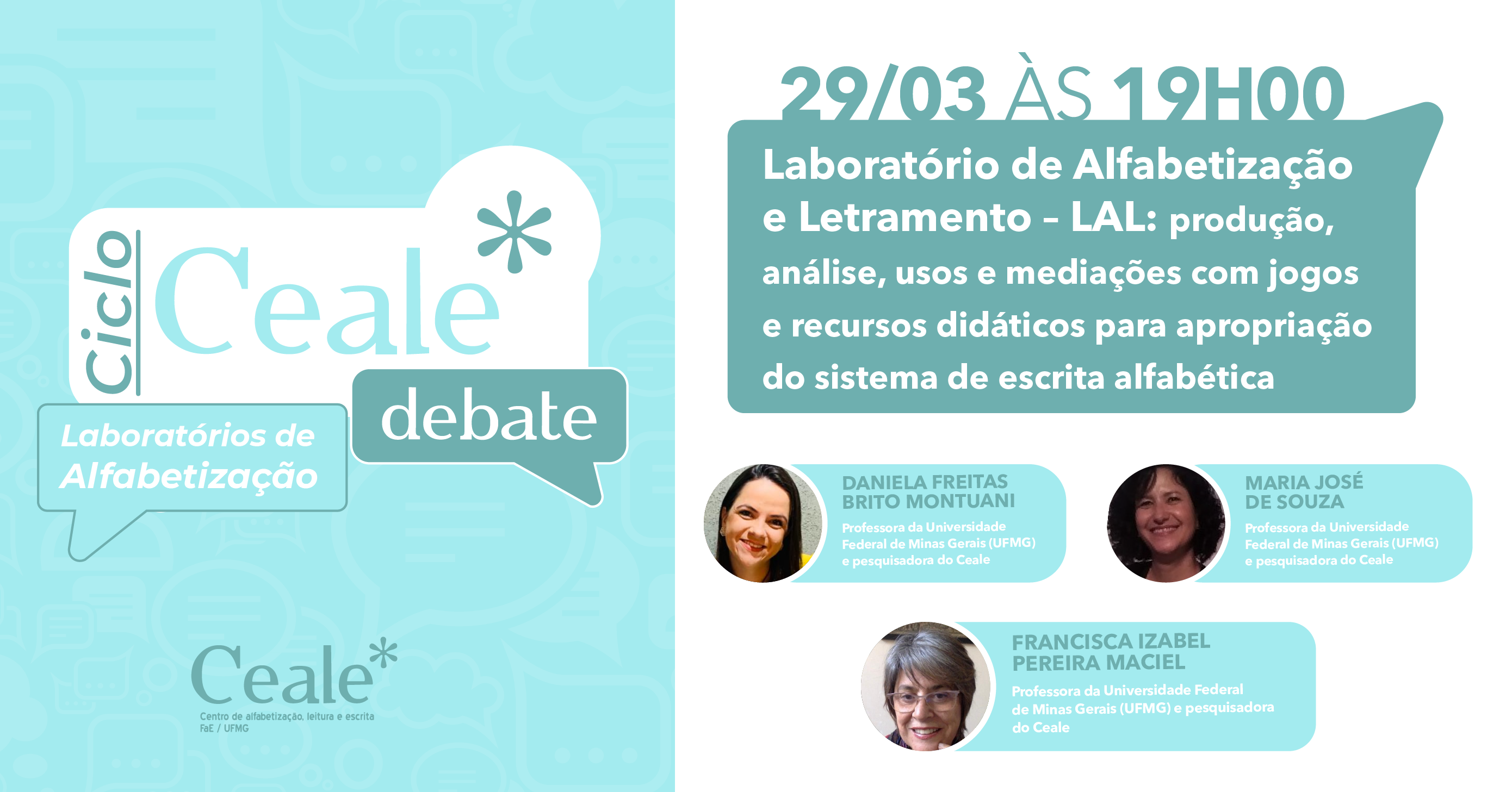 No próximo dia 29 de março, terça-feira, às 19h, o Ceale Debate inicia o ciclo sobre os Laboratórios de Alfabetização, começando pelo LAL- Laboratório de Alfabetização e Letramento. Para conversar sobre o assunto, teremos a presença das coordenadoras do laboratório, as professoras Daniela Montuani e Maria José Souza.