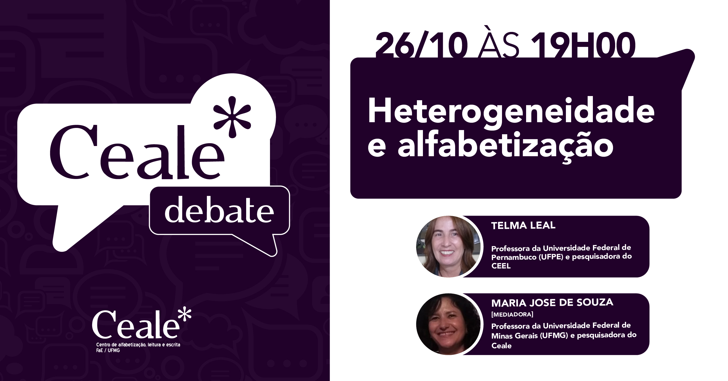 No próximo dia 26 de outubro, quarta-feira, às 19h, o Ceale Debate recebe a professora da Universidade Federal de Pernambuco, Telma Leal, para conversarmos sobre a heterogeneidade humana e a alfabetização.