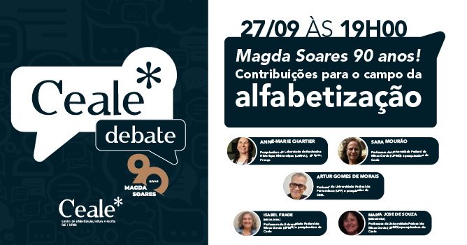 No próximo dia 27 de setembro, terça-feira, às 19h, o Ceale Debate de setembro, em homenagem aos 90 anos da professora Magda Soares, discute sobre as produções mais recentes da professora e suas contribuições para os estudos da alfabetização e letramento. Para a palestra, receberemos como convidados a pesquisadora francesa Anne-Marie Chartier, a professora Sara Mourão (UFMG) e o professor Artur Gomes de Morais (UFPE), além da mediação das professoras Maria José de Souza (UFMG) e Isabel Frade (UFMG).