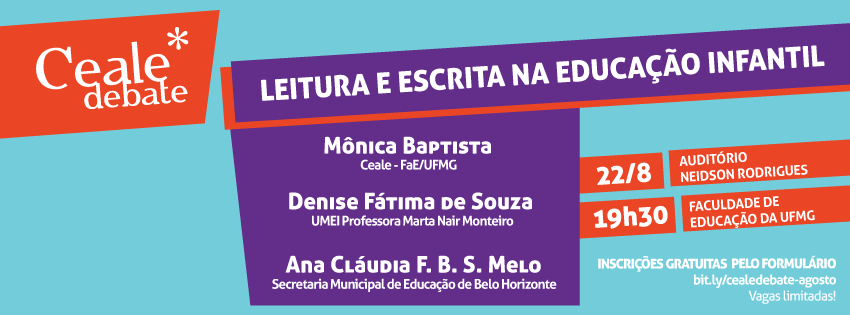 Alfabetização, leitura e escrita: o que a educação infantil tem a ver com isso? Esta é uma das perguntas norteadoras do próximo Ceale Debate, que irá trazer uma reflexão sobre o projeto Leitura e Escrita na Educação Infantil, que produziu uma coleção de cadernos de formação para professores da Educação Infantil, além de promover pesquisas, estudos, conferências e seminários. Para a discussão o Ceale Debate de agosto convida a pesquisadora Mônica Correia Baptista, para apresentar o projeto do qual é coordenadora, e as professoras Denise Fátima de Souza e Ana Cláudia Figueiredo Brasil Silva Melo, ambas da Rede Municipal de Ensino de Belo Horizonte, que irão realizar uma leitura crítica sobre os impactos da ação promovida, na prática. O evento será realizado no dia 22 de agosto (terça-feira), das 19h30 às 21h30, no Auditório Neidson Rodrigues da Faculdade de Educação da UFMG, campus Pampulha (Avenida Antônio Carlos, 6.627).