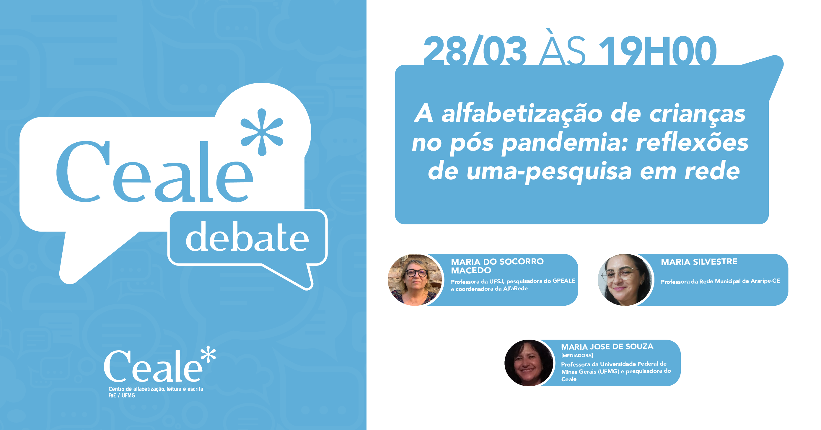 No dia 28 de março, às 19h, o Ceale Debate recebe as professoras Maria do Socorro Nunes Macedo (UFSJ) e Maria Silvestre (Rede Municipal de Araripe - CE) que vão apresentar resultados de uma pesquisa nacional que vem acompanhando a alfabetização desde 2020, quando se iniciou a pandemia.
