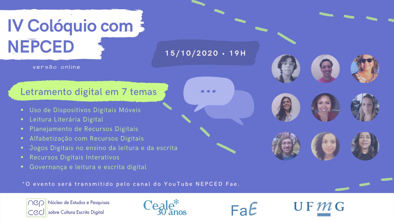 Amanhã, a partir das 19h, acontece o IV Colóquio com NEPCED. O evento discutirá o letramento digital em sete temas: uso de dispositivos digitais móveis; leitura literária digital; planejamento de recursos digitais; alfabetização com recursos digitais; jogos digitais no ensino da leitura e da escrita; recursos digitais interativos; governança e leitura e escrita digital.