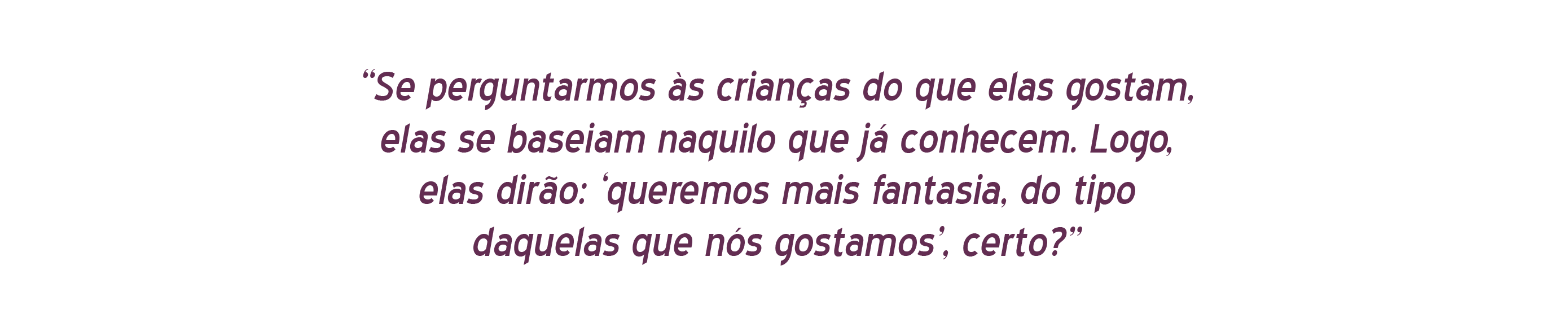 É muito interessante quando olhamos para propagandas, filmes ou livros e o efeito que têm sobre as crianças. A maioria das pesquisas mostra que as crianças vão negar: “eu não sou influenciado por isso”, mas provavelmente são sim. Se você perguntar a outro grupo, como garotas adolescentes, sobre a influência de Jogos Vorazes e Crepúsculo, elas dirão: “nós sabemos a diferença entre fantasia e vida real”. Esses romances de mocinha e mocinho são extremamente populares e conhecidos. Em uma pesquisa conduzida por um colega sobre esse tema, houve entrevistas a muitas pessoas, e a reação sempre era: “sim, nós sabemos que aquilo não é real e que príncipe nenhum resgata a princesa, sabemos que nada é perfeito na vida real” e por aí vai, “o que não significa que não nos divertimos ao ler isso”. É fato para todos nós: lemos fantasia mesmo sabendo que não é real. A questão é a seguinte: crianças sabem a diferença entre fantasia e vida real, subconscientemente estão se alimentando disso.