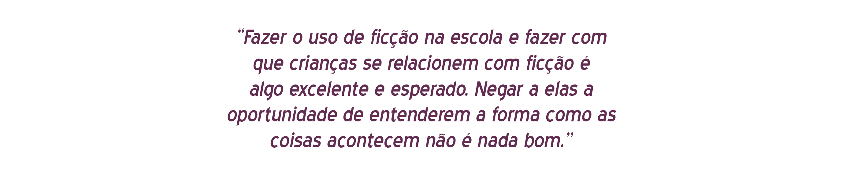 Nos anos 1980 e 1990, as melhores escolas tinham ficção como parte de seu projeto. Livros estavam à disposição e as crianças podiam ler tudo o que quisessem. Se quisessem, por exemplo, ler um romance, os adultos podiam ler para elas. Não haveria questões de prova após a leitura, mas perguntas como: “e o que vai acontecer depois?”, o que é muito mais envolvente. E, assim, as crianças aprendiam nossos modelos de contar histórias, que são algo muito presente em nossas vidas, como os psicólogos mesmo dizem.