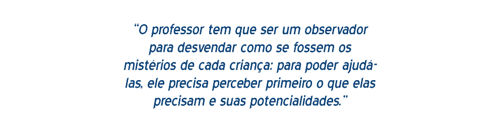 Acho que o professor precisa ser, antes de tudo, um observador das crianças e tentar captar, por meio da observação, situações em que as crianças parecem se sentir um pouco mais à vontade, e investir nessas situações. Ele tem que ser um observador para desvendar como se fossem os mistérios de cada criança: para poder ajudá-las, ele precisa perceber primeiro o que elas precisam e suas potencialidades. Onde ele poda, pode estar o potencial.