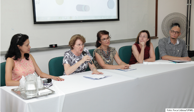 Da esquerda para a direita: Míriam Jorge (professora da FaE/UFMG) Adelina Martha dos Reis (Pró-Reitora de Pesquisa da UFMG); Juliane Corrêa (Diretora da FaE/UFMG); Graciela Ravetti (Diretora da FALE/UFMG); Sérgio Cirino (Diretor de produção científica da PRPq).