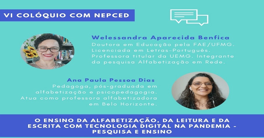 No próximo dia 6, às 20h, ocorre o VI Colóquio com NEPCED (Núcleo de Estudos e Pesquisa sobre Cultura Escrita Digital do Ceale/FaE/UFMG), que terá o tema "O ensino da alfabetização, da leitura e da escrita com tecnologia digital na pandemia - pesquisa e ensino". As convidadas são as professoras Welessandra Aparecida Benfica e Ana Paula Pessoa Dias. Haverá emissão de certificados.
