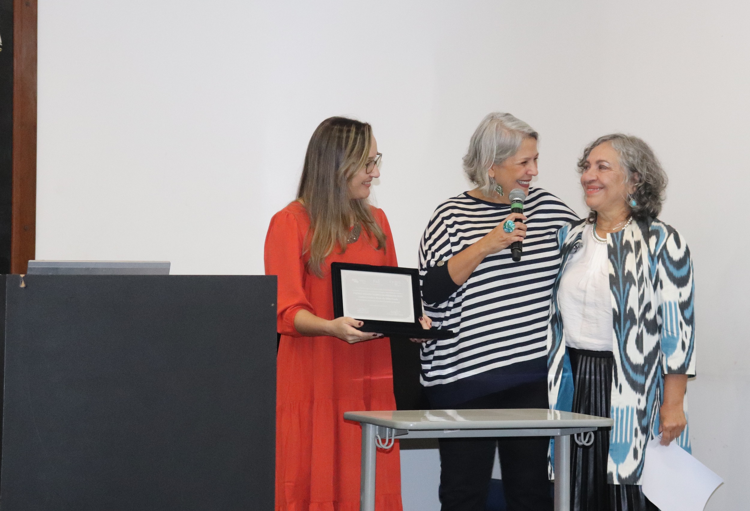 Em seguida, aconteceu a entrega do Prêmio Magda Soares à Professora Doutora Isabel Frade, que também é pesquisadora do Ceale. Isabel é Presidente emérita da Associação Brasileira de Alfabetização e já trabalhou e coordenou projetos como o PNLD, PNAIC e a Base Comum Curricular, além da sua atuação como diretora do Ceale entre 2012 e 2014. A professora, muito emocionada, agradeceu o prêmio e relembrou a saudosa Magda Soares em sua trajetória acadêmica. Após receber o prêmio, Isabel encabeçou uma mesa em que apresentou parte de sua pesquisa sobre a cultura escrita digital e alfabetização.