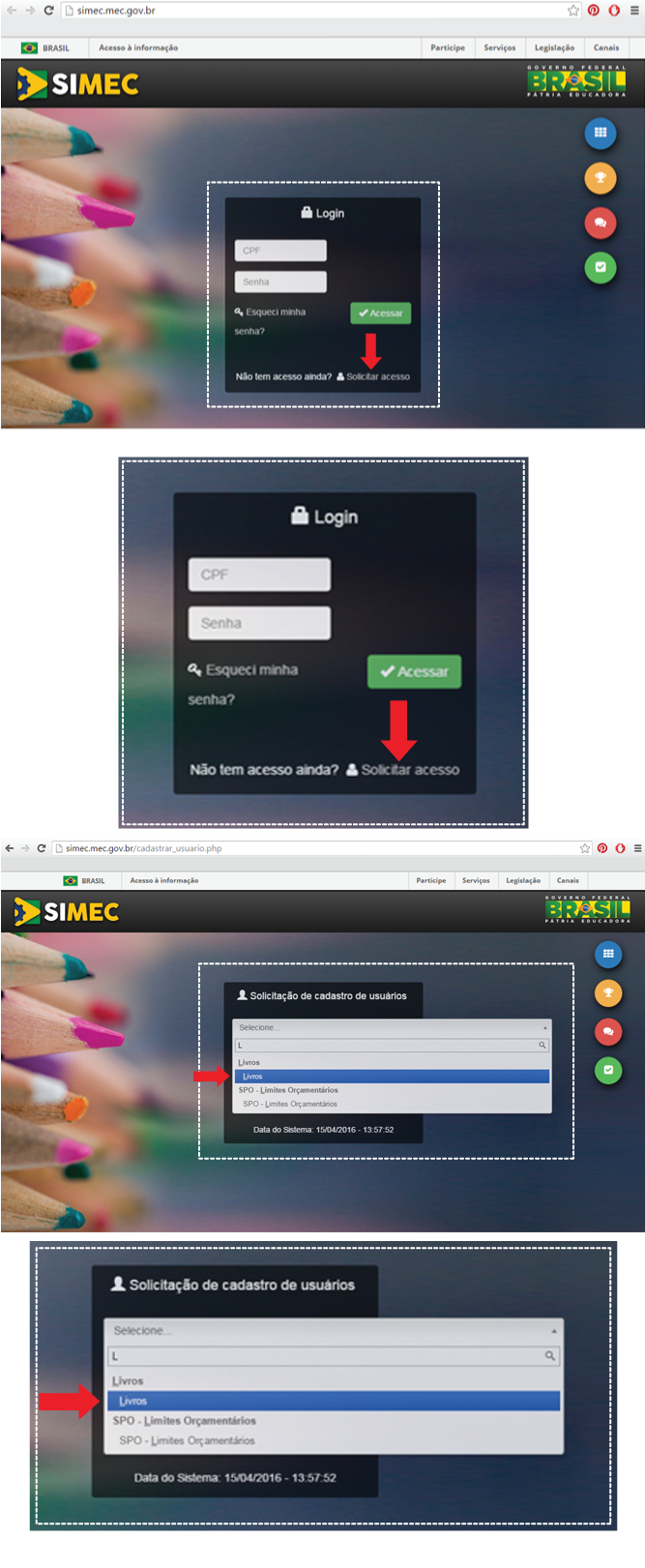 O Ministério da Educação prorrogou até 23 de maio o prazo para realizar cadastro no Banco de Avaliadores dos Programas Nacionais do Livro e da Leitura e de conteúdos de Recursos Educacionais Digitais. O cadastro, que deve ser feito pelo SIMEC (orientações abaixo), será válido para todos os processos de avaliação no âmbito da Secretaria de Educação Básica para o ano de 2016.