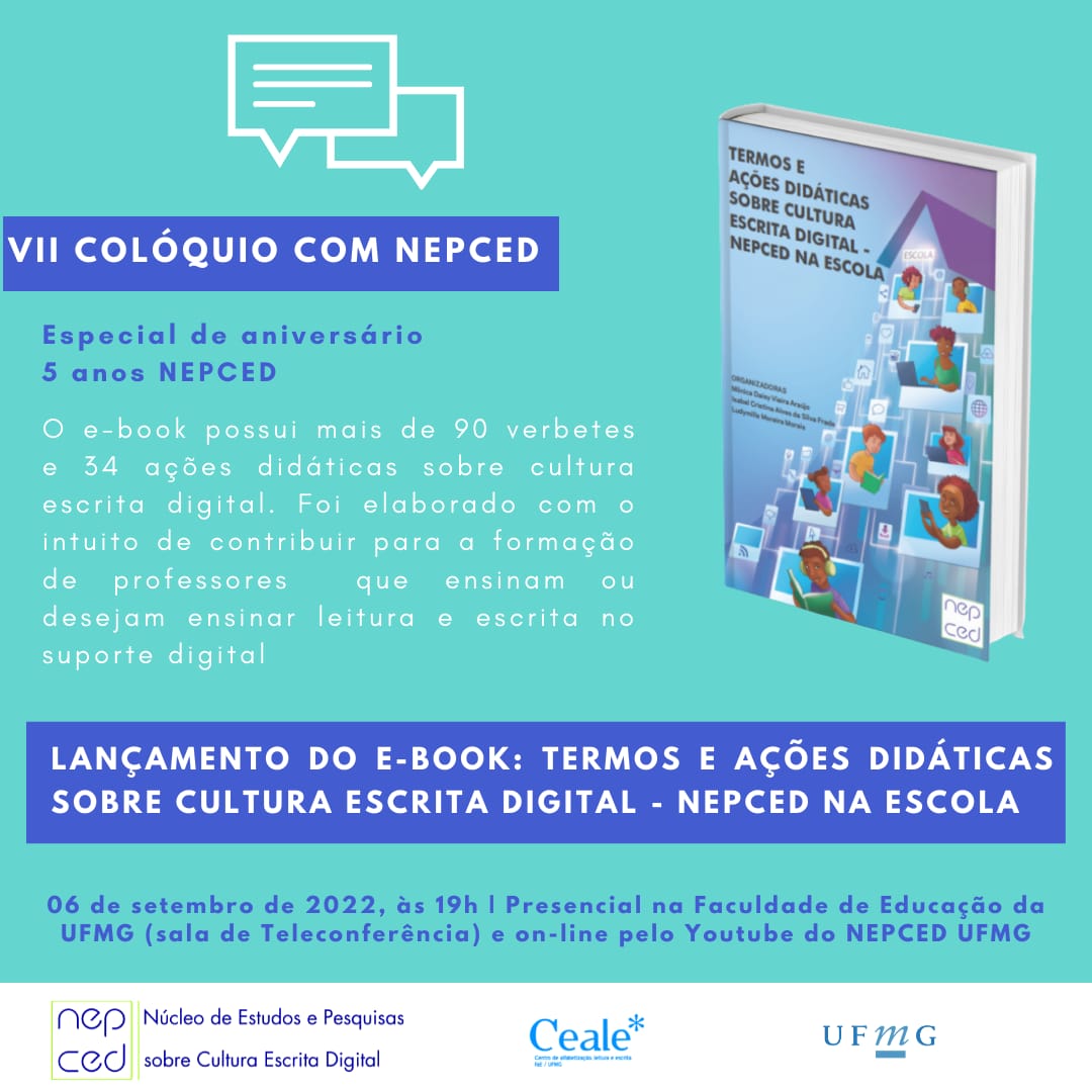 No próximo dia 06 de setembro, terça-feira, às 19h, o Núcleo de Estudos e Pesquisas sobre Cultura Escrita Digital/NEPCED/CEALE/UFMG fará o lançamento do e-book Termos e Ações didáticas sobre Cultura Escrita Digital- Nepced na Escola, durante o VII Colóquio com Nepced, em comemoração aos 5 anos do Núcleo. O evento ocorrerá em formato hibrido, presencial na Faculdade de Educação/UFMG (sala de Teleconferência) e pelo YouTube do NEPCED.