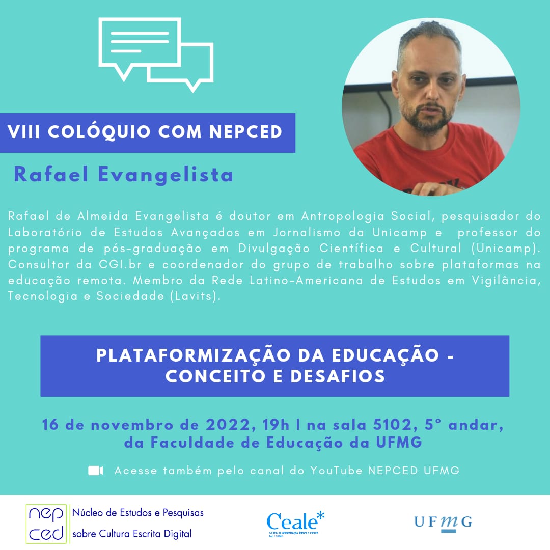 No 16 de novembro, quarta-feira, às 19h, o Núcleo de Estudos e Pesquisas sobre Cultura Escrita Digital - Nepced/Ceale realizará o VIII Colóquio com o NEPCED. O convidado Rafael Evangelista – Consultor da CGI.br – vai conversar sobre “Plataformização da educação – Conceito e Desafios”.
